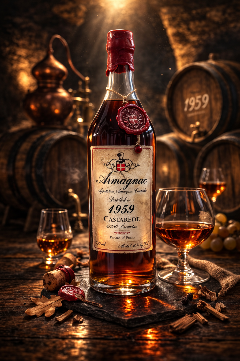 Distilled in 1959, Castarède Vintage Armagnac showcases decades of patient maturation. Expect layered notes of dried fig and prune, gentle cocoa, toasted oak, and warming spice with a long, elegant finish—perfect for collectors and milestone gifts.