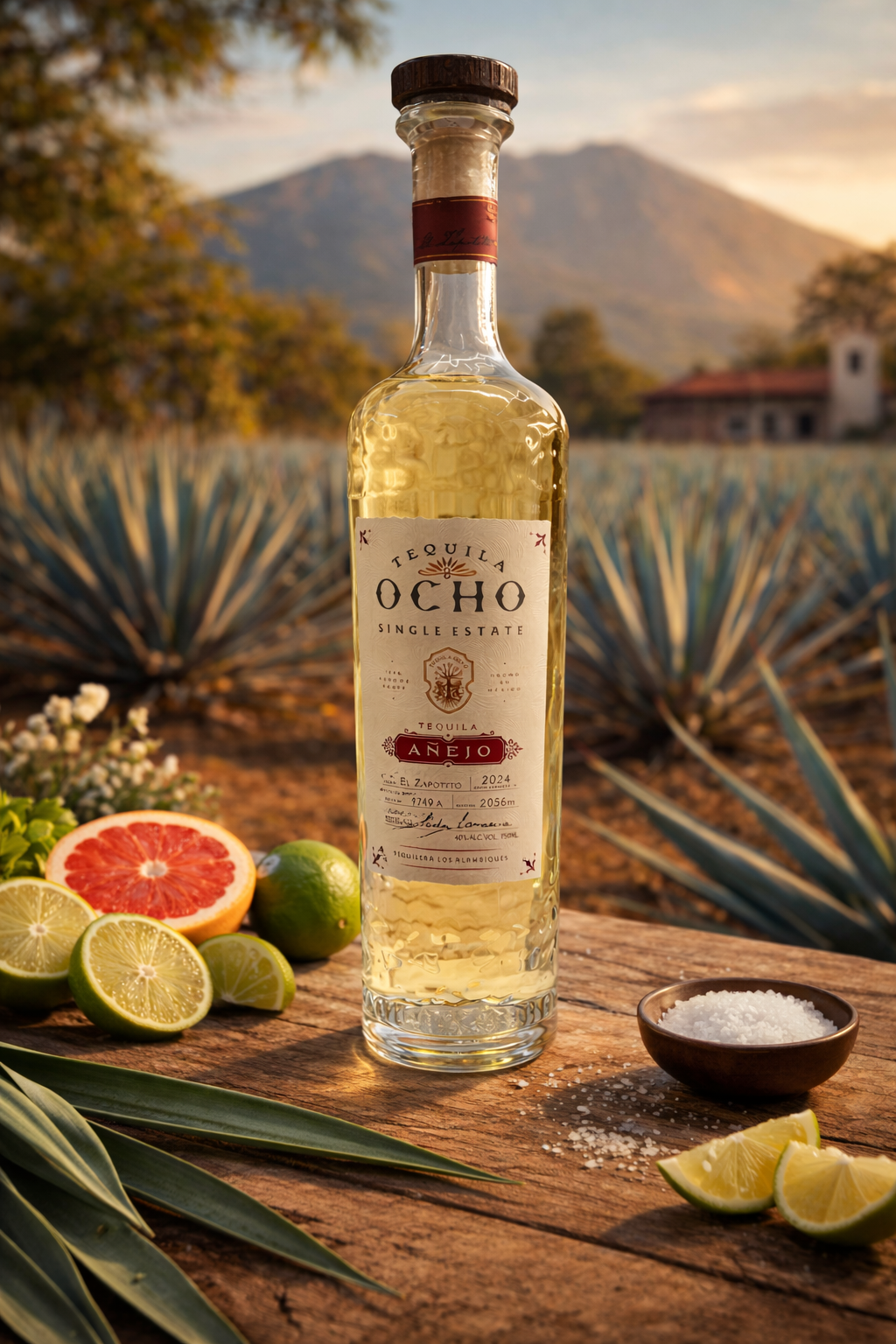Tequila Ocho Añejo is a premium 100% Blue Weber Agave tequila from Jalisco, Mexico, known for being authentic, agave-forward, and beautifully aged in oak barrels long enough to add rich flavor, but it still keeps that natural cooked-agave taste. Ocho is famous because it’s a single-estate tequila — each bottle comes from one specific agave field (rancho), so every release has its own unique character (kind of like a fine wine).