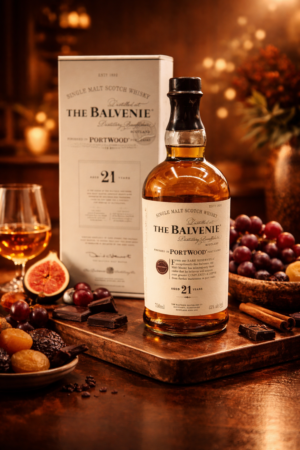The Balvenie 21 Year PortWood is a premium Scotch whisky selected for collectors and special-occasion pours—crafted to showcase mature cask character, layered aroma, and a long, elegant finish.