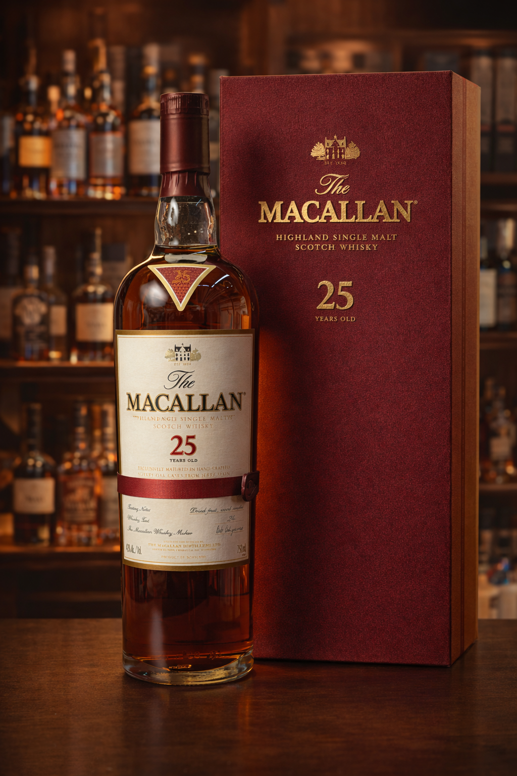The Macallan 25 Year is a premium Scotch whisky selected for collectors and special-occasion pours—crafted to showcase mature cask character, layered aroma, and a long, elegant finish.